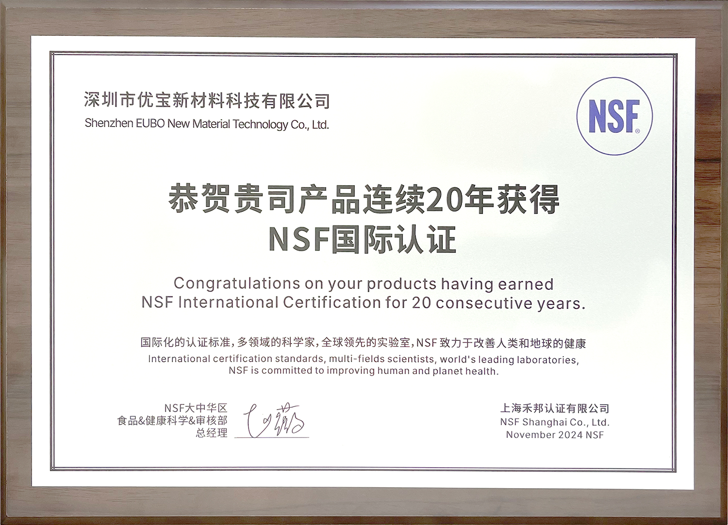 連續(xù)20年獲得NSF國際認證